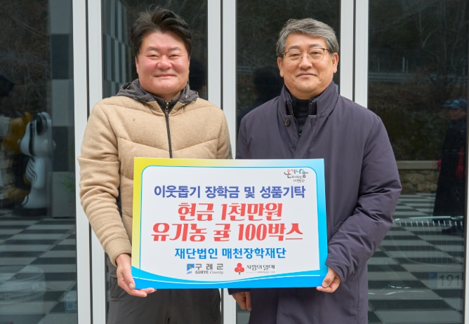 [호남자치뉴스]전남 구례군은 지난 14일, (재)매천장학재단(이사장 김용목)이 지역 내 저소득가정 학생들을 위한 장학금 1,000만 원과 유기농 귤 100박스를 기탁했다고 밝혔다.