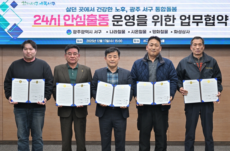 [호남자치뉴스]광주광역시 서구가 주민 일상 속 불편을 신속하게 해소하기 위해 팔을 걷어붙였다. 서구는 17일 서구청 나눔홀에서 관내 착한가게 4곳과 함께 ‘24시 안심출동’ 사업의 안정적 운영을 위한 업무협약을 맺고 빈틈없는 돌봄 서비스 제공에 협력하기로 했다. 이날 협약식에는 김성배 부구청장을 비롯해 윤순섭 화성상사 대표, 이영일 평화철물 대표, 주재식 나라철물 대표, 이영주 시온철물 대표가 참석했다. 이 업체들은 매월 정기 기부로 나눔을 실천하는 ‘착한가게’로 이웃돌봄 역할에도 적극적으로 참여하고 싶다는 뜻을 밝혔다.