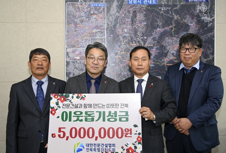 [호남자치뉴스]남원시는 12월 19일 대한전문건설협회 전북도회(회장 임근홍)와 남원지회(회장 김재주)가 '희망2026 나눔 캠페인'에 동참하며 500만 원의 성금을 기탁했다고 밝혔다.